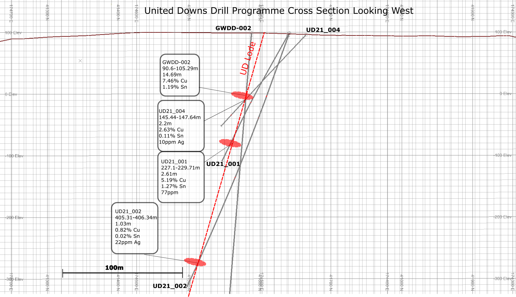 Initial drilling results from the “UD Lode” in April 2020 proved the existence of a high-grade copper-tin structure. Results from the most recent round of drilling confirm that the mineralisation extends laterally, but further interpretation of the geology has revealed that the UD Lode does not follow typical structures in the area. Rather than the typical near-vertical, more northerly dipping structures common in the area, the UD Lode instead dips steeply towards the south. Copper grades in the drilling results so far reflect historical mine production from United Mines, just 200m south of the UD Lode.