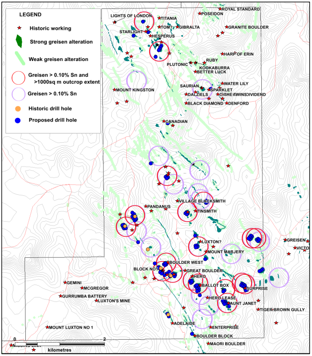Based on this work, EV Resources now plans to begin a 3,000m drilling campaign in May 2022. This work will focus on the Boulder area, expanding the mineralisation footprint established by previous drilling – both laterally and at depth. 12 additional, high priority greisen targets, with no previous exploration, will also be drilled.