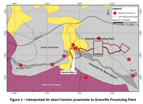 Furthermore, the Central Big H prospect is of some interest. The skarn geology is similar to that already being exploited at Granville and so could represent similar high-grade mineralisation. Assay results at Granville indicate >1% Sn, up to 4.9% Sn; the first ore blocked mined at the site was 2.1% Sn. With the prospect being located so close to the existing processing plant, this represents a relatively low-cost expansion target in the medium- to long-term future.