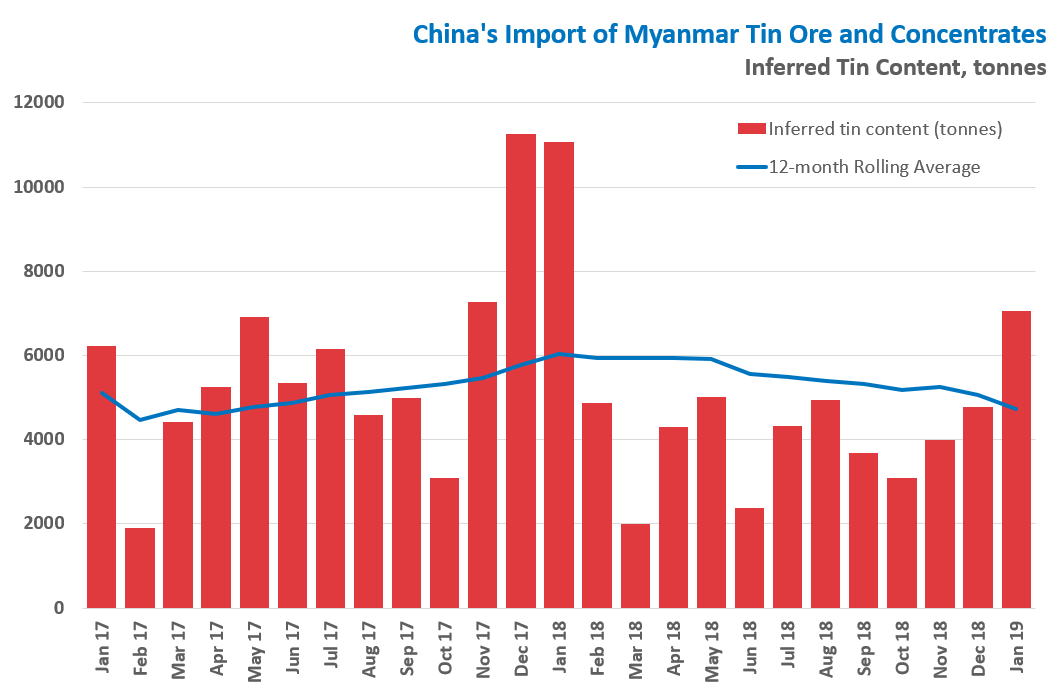 China’s imports of tin ores and concentrates totalled 30,719 tonnes in January, with 29,389 tonnes from Myanmar, according to the latest official customs statistics. The estimated tin content of shipments from Myanmar in January was 7,100 tonnes, up 48% month-on-month, but down 36% year-on-year.