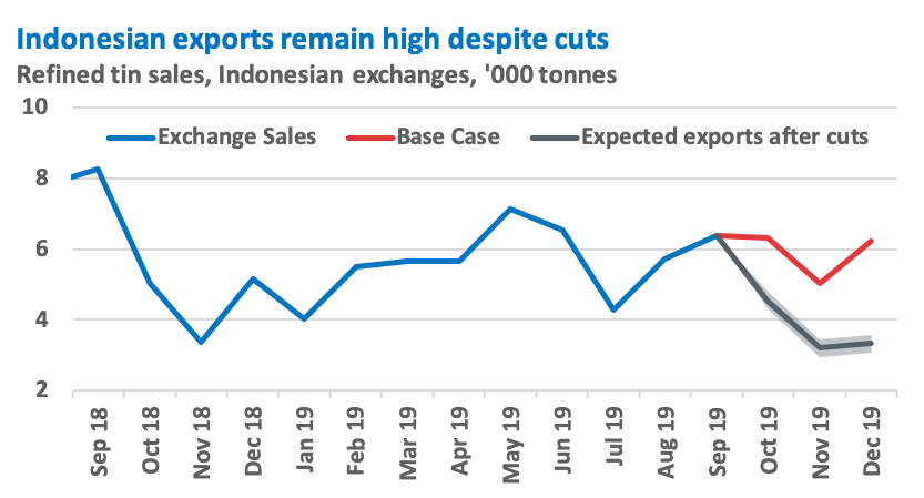Our view: Current reported stocks of refined tin metal held by Indonesian producers total some 8,300 tonnes, and will need to be reduced before the market is impacted by the reduction in refined tin production. That being said, should exports fall to around 4,000 tonnes per month, this would put the market in a significant deficit during Q4, assuming demand forecasts hold true.
