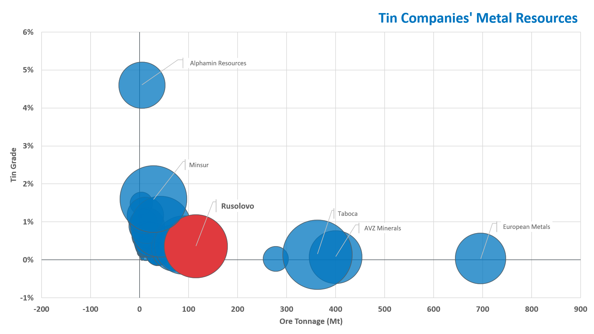 Rusolovo (red) now has the fourth highest tin resource when measured as a combination of companies’ individual projects and mines.