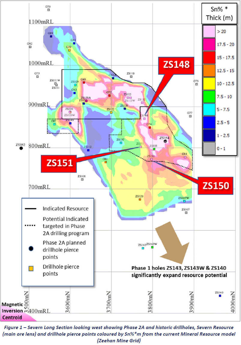 Heemskirk is formed of multiple tin deposits, the largest of which – Severn – has seen significant drilling over the last two years. The current “Phase 2A” drill programme aims to increase the Indicated Mineral Resource at Severn.
