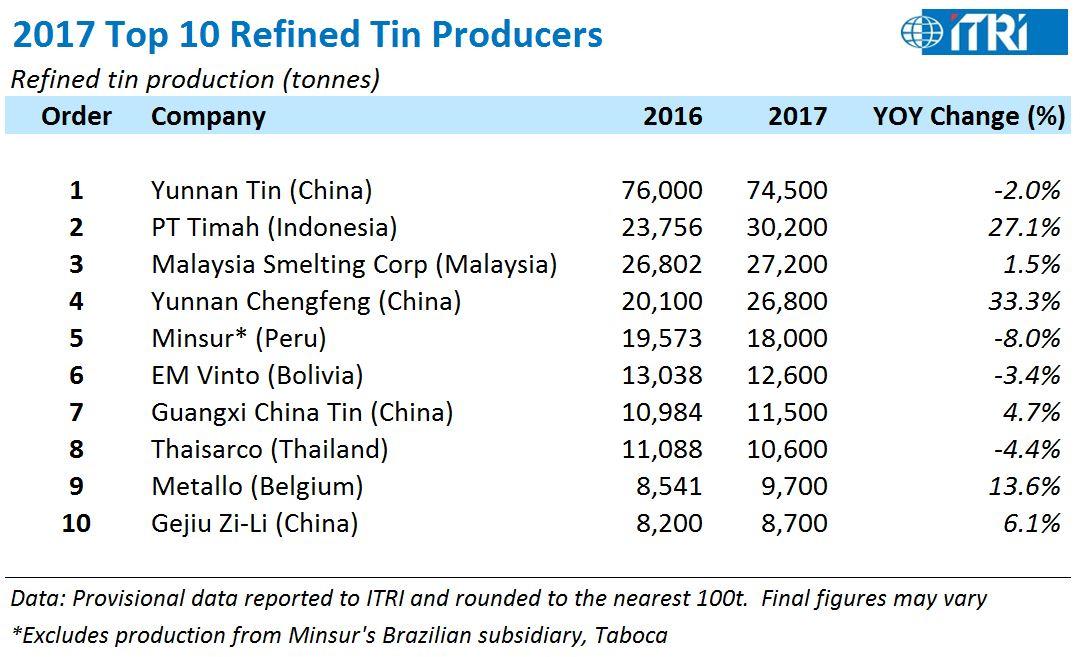 ITRI reports that six of the top ten refined tin producers saw an increase in production in 2017, including three of the biggest five companies.
