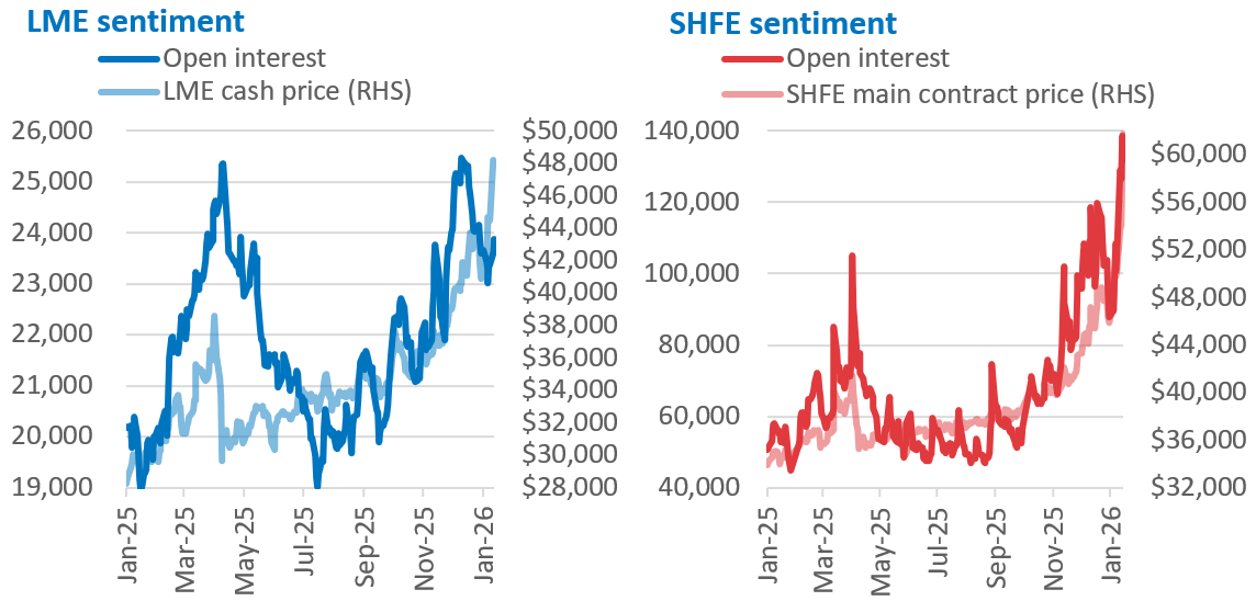 LME and SHFE data demonstrate a gradual rise in open interest over December and then a sharp increase on the SHFE over the past two weeks, corresponding with the price surge.